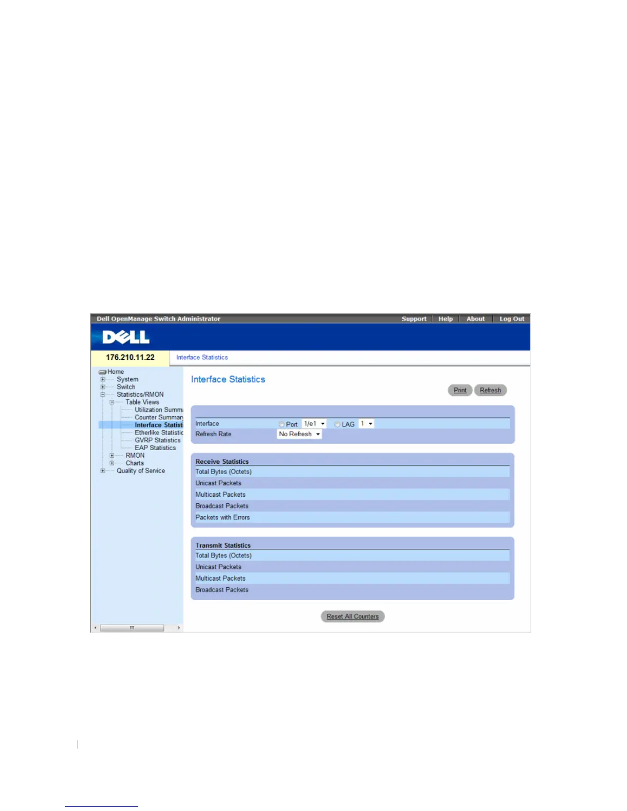 To open the Interface Statistics page, click Statistics/RMON → Table Vie ws → Interface Statistics in the