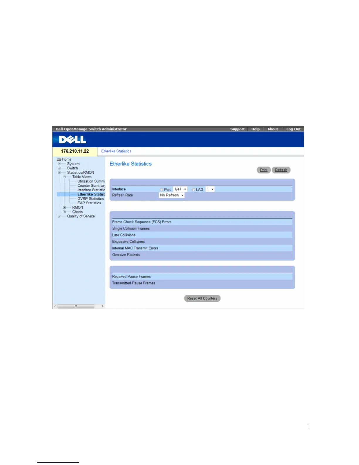 To open the Etherlike Statistics page, click Statistics/RMON → Table Views → Etherlike Statistics in the