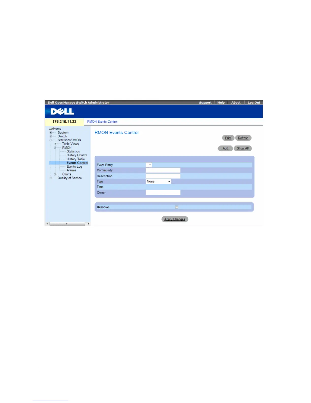 page, click Statistics/RMON→ RMON→ Events Control in the tree view.