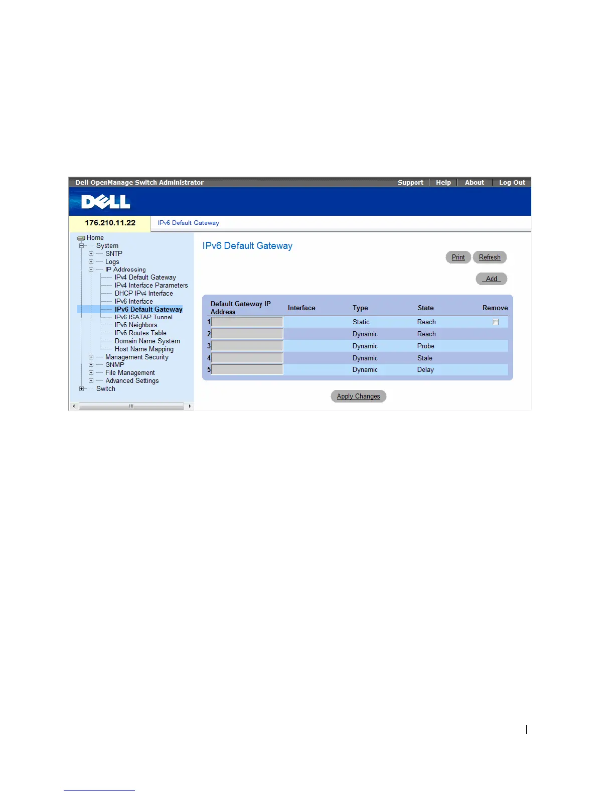 To open the IPv6 Default Gateway page, click System→ IP Addressing→ IPv6 Default Gateway in the