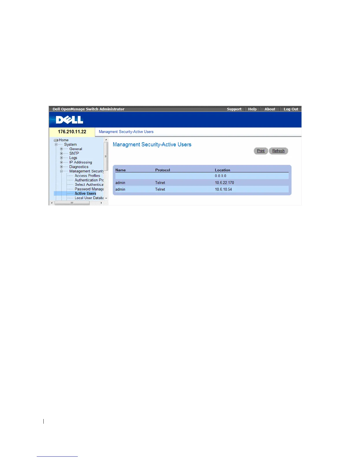 The Active Users page contains information about who is currently logged in to the device.