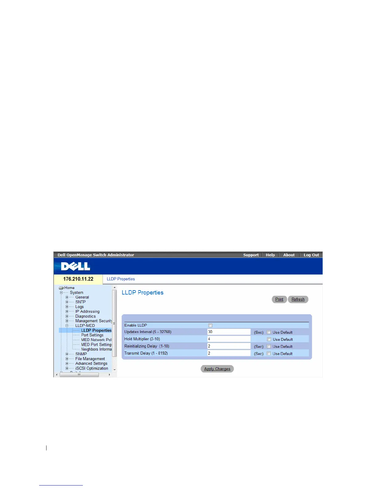 The LLDP Properties page contains fields for configuring LLDP.