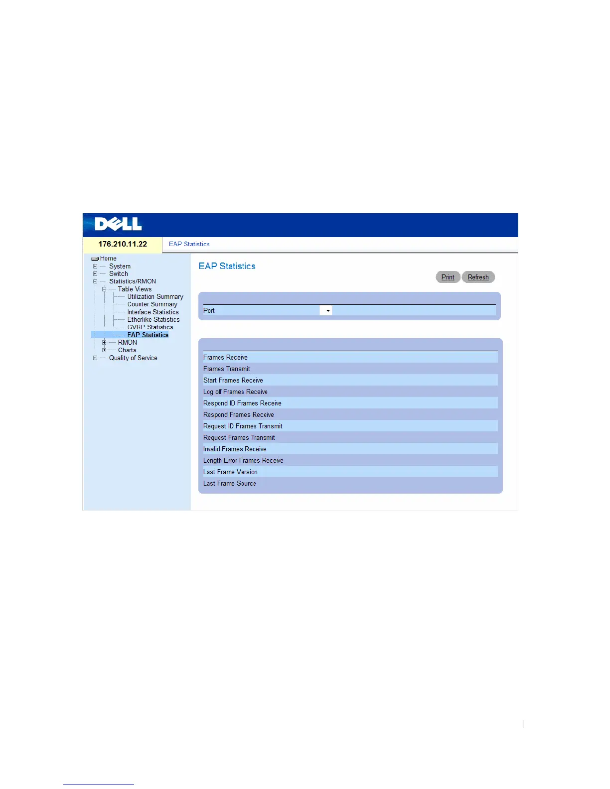 The EAP Statistics page contains information about EAP packets received on a specific port. For more