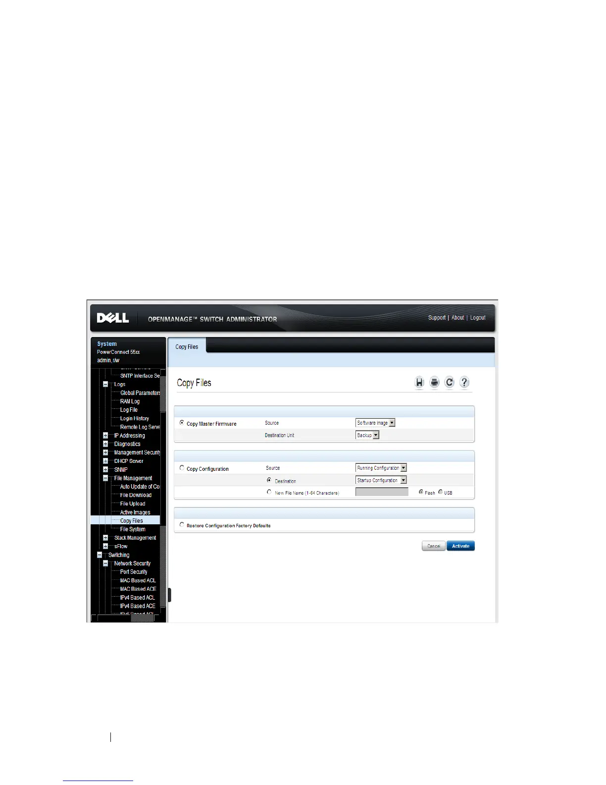 • Copy a configuration file to the Running Configuration file. It is