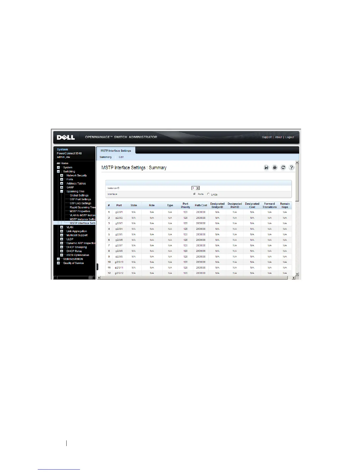 MSTP interface settings for the selected instance is displayed.