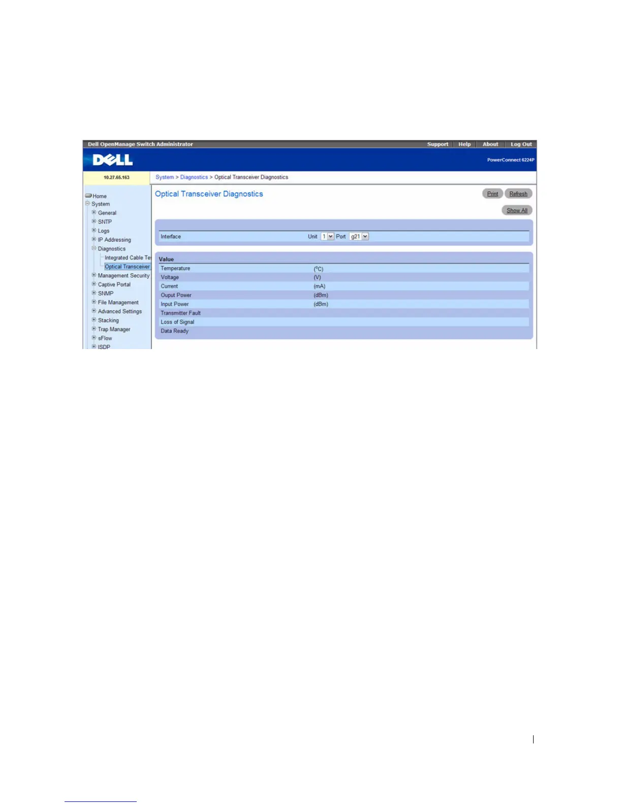 NOTE: Finisar transceivers do not support the transmitter fault diagnostic testing. Fiber Optic analysis feature works