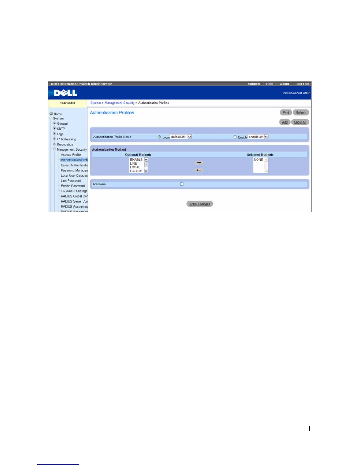 authentication profile to govern either Login or Enable part of the switch’s operations, and to select one
