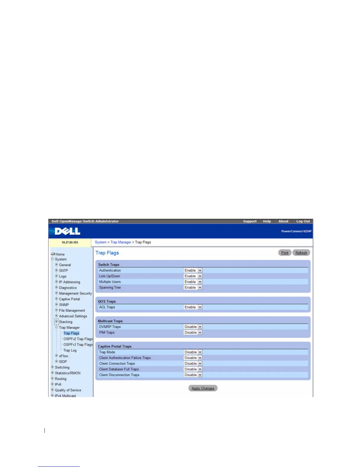Use the Trap Manager menus to configure traps flags and view the trap log. Click System
