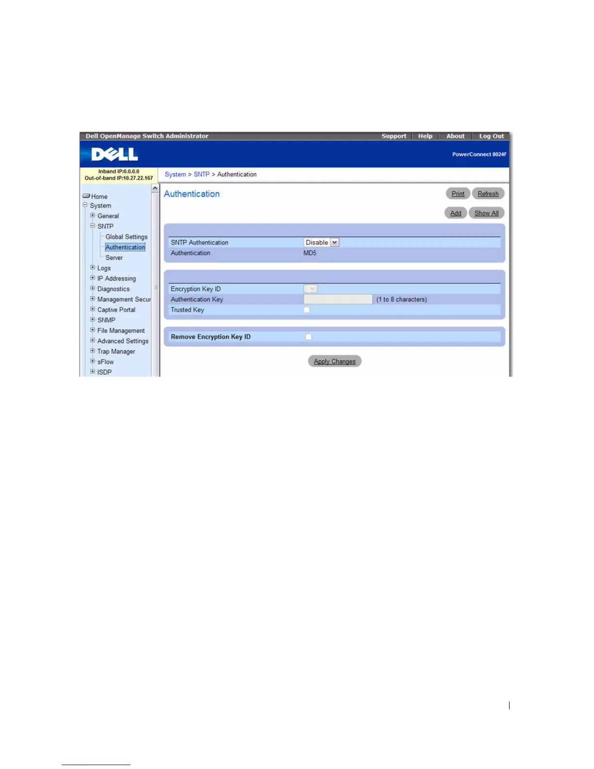 The SNTP Authentication page contains the following fields: