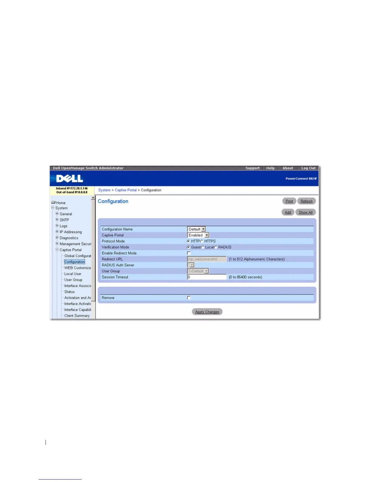 To view summary information about existing captive portals, or to add or delete a captive portal, click