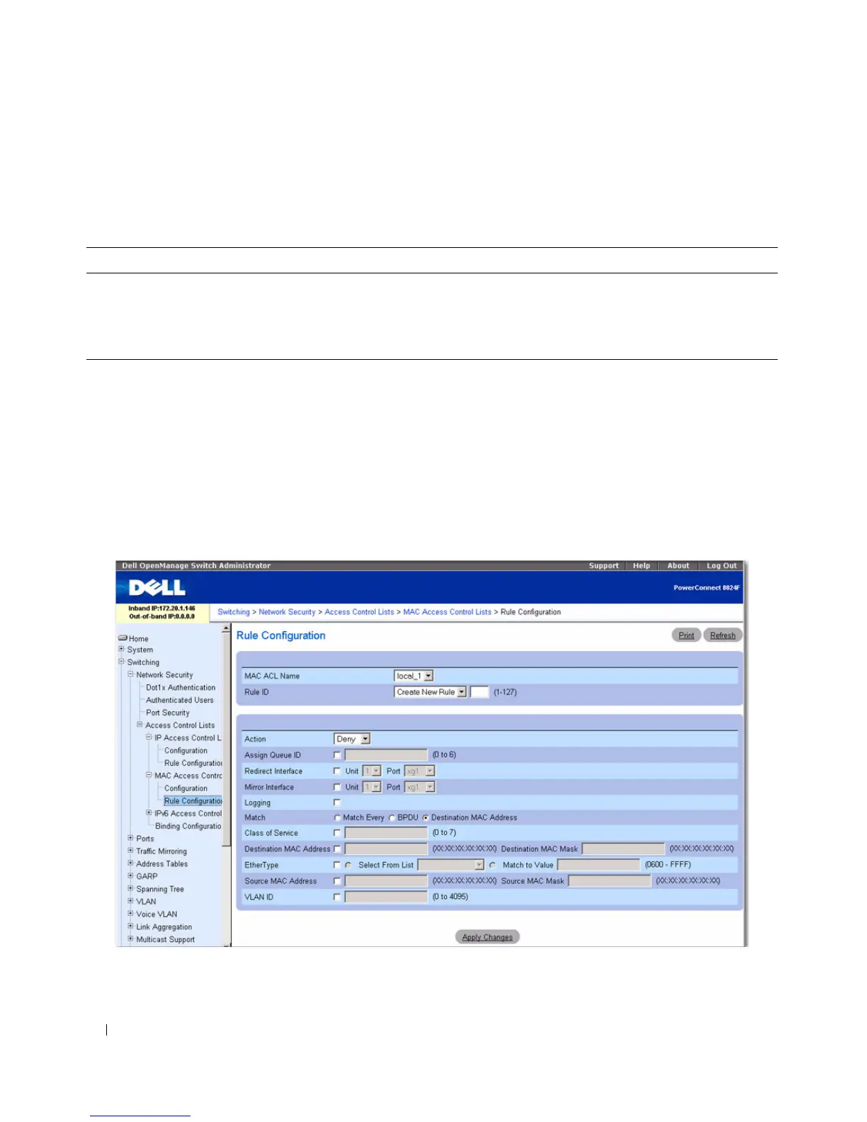 Use the MAC ACL Rule Configuration page to define rules for MAC-based ACLs. The access list
