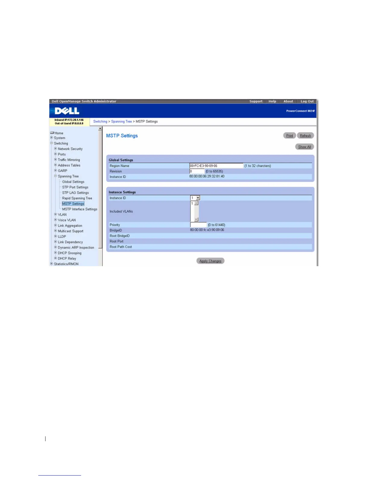 The MSTP Settings page contains the following fields divided into two sections, Global Settings and