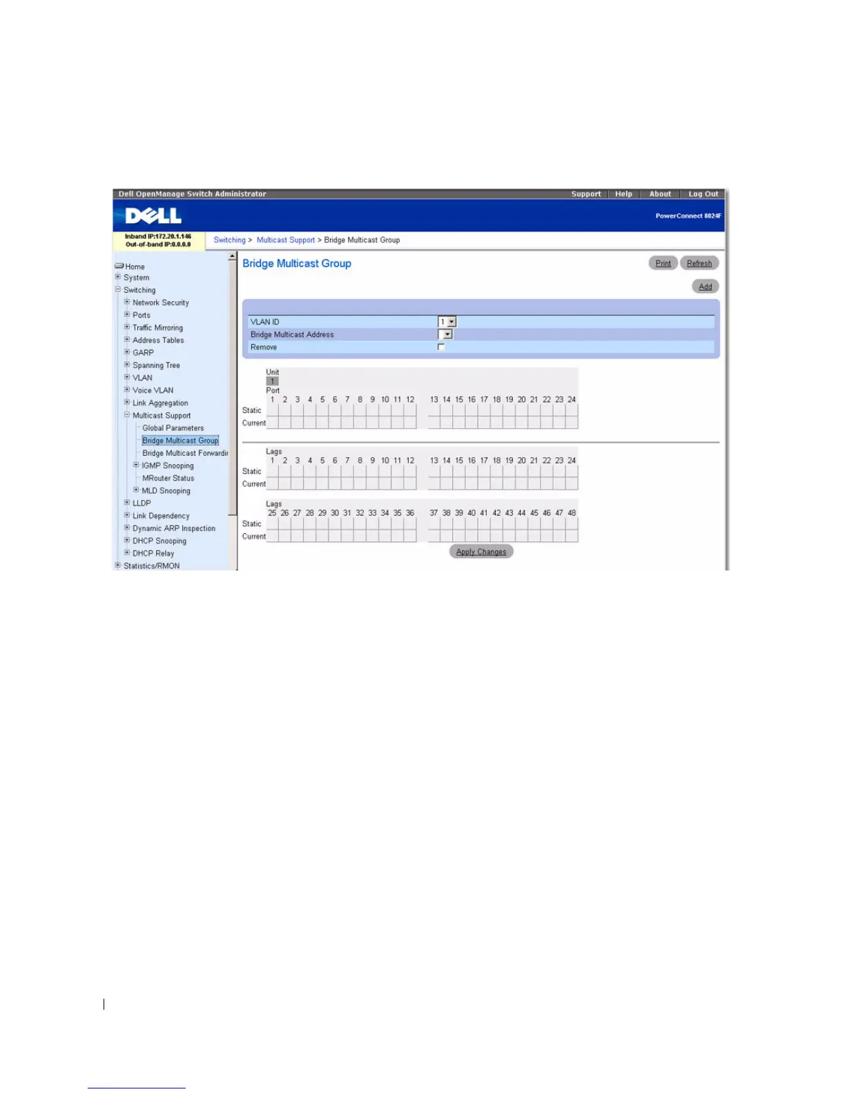 The Bridge Multicast Group tables display which Ports and LAGs are members of the multicast group,