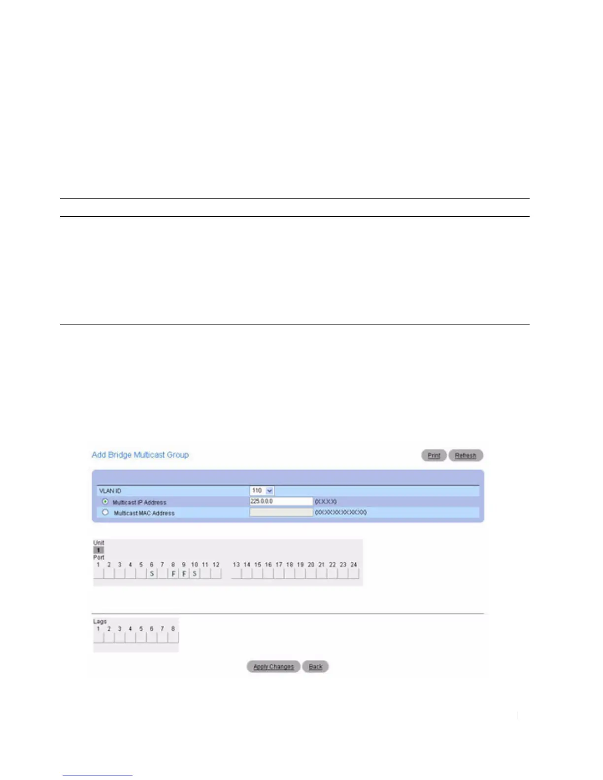 F Forbidden: Indicates that the port/LAG is forbidden entry into the Multicast group in the
