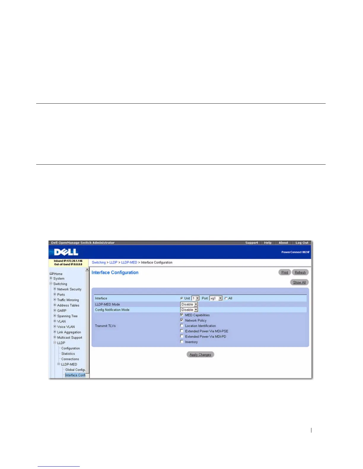 Use the LLDP-MED Interface Configuration page to specify LLDP-MED parameters that affect a