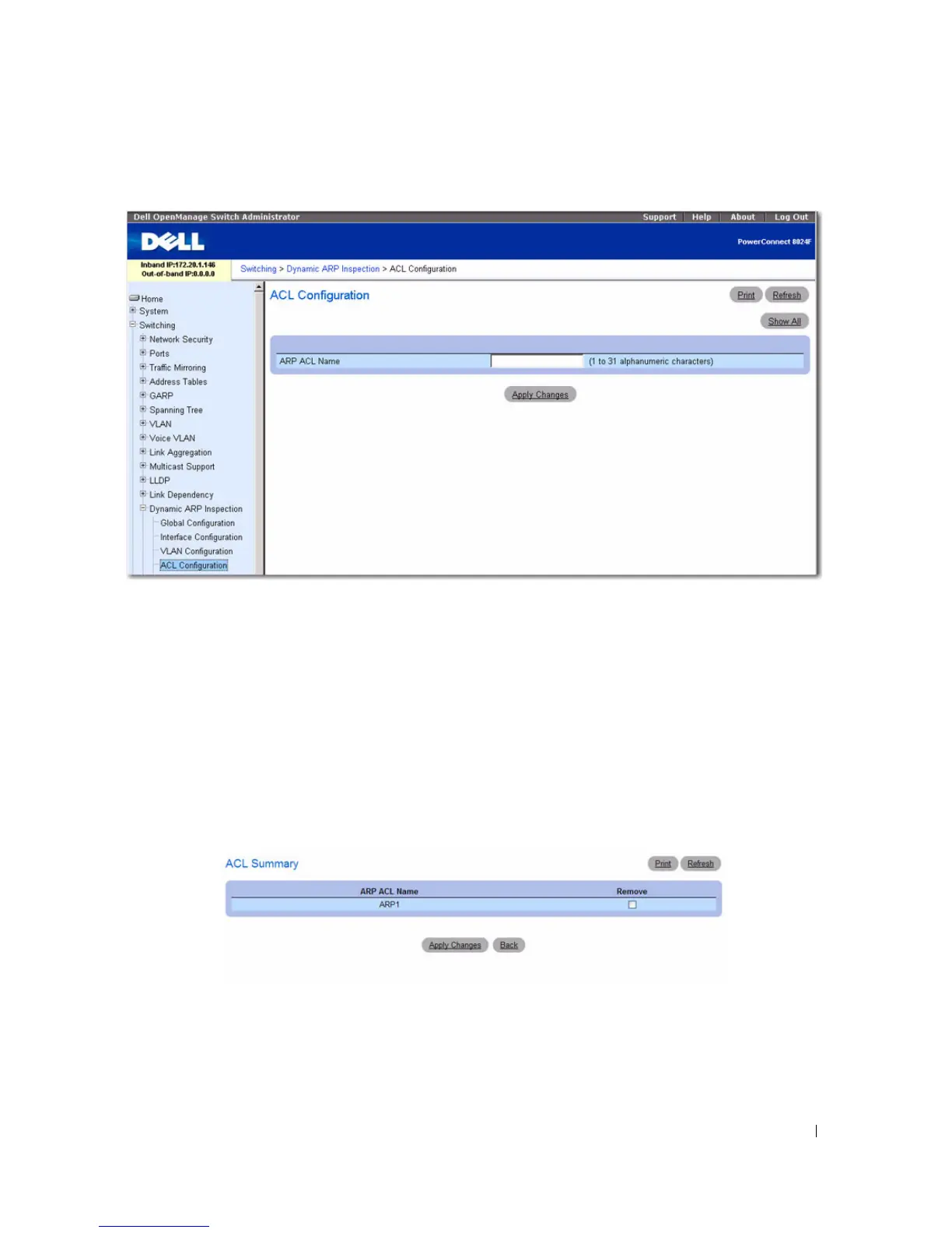 The Dynamic ARP Inspection ARP ACL Configuration page contains the following field: