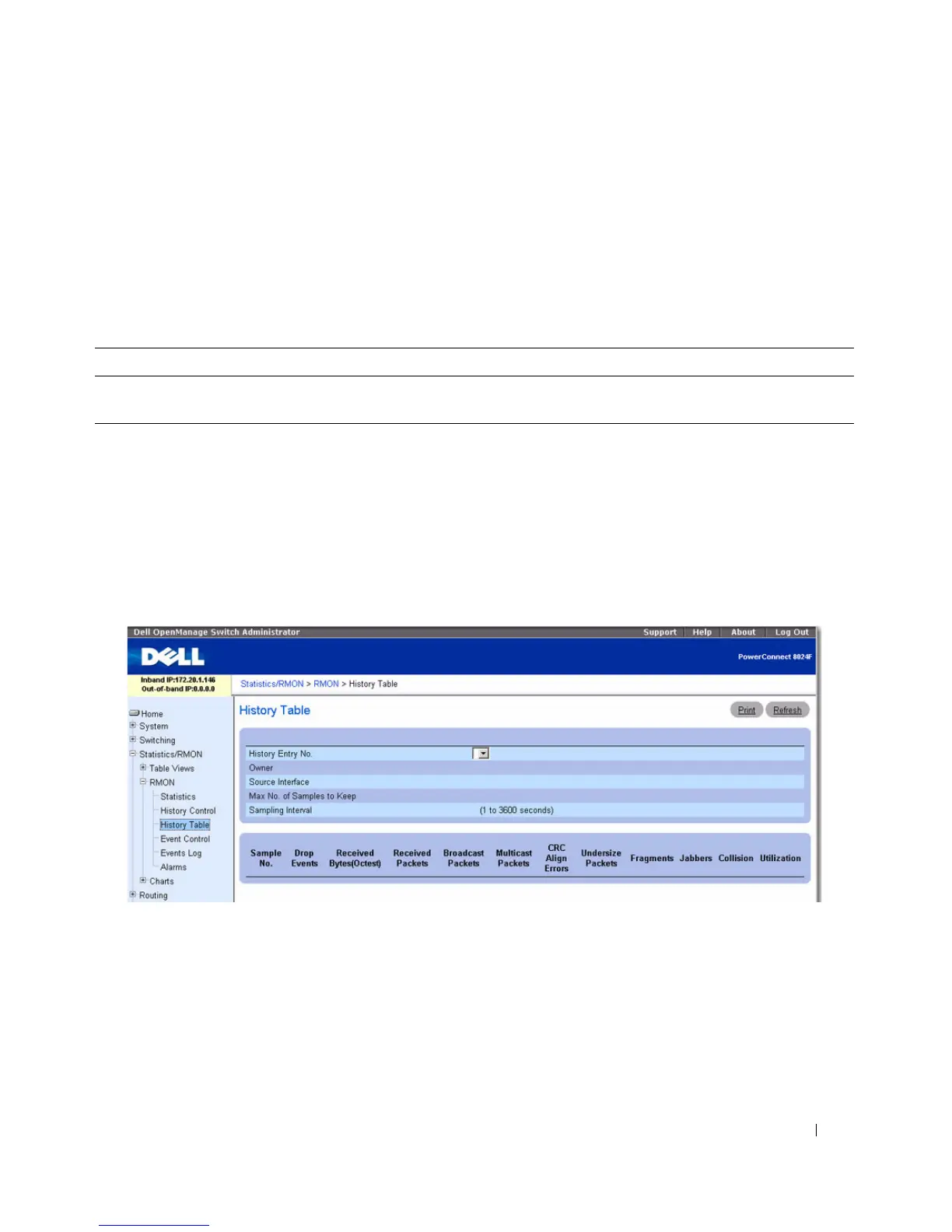 Use the RMON History Table page to display interface-specific statistical network samplings. Each table