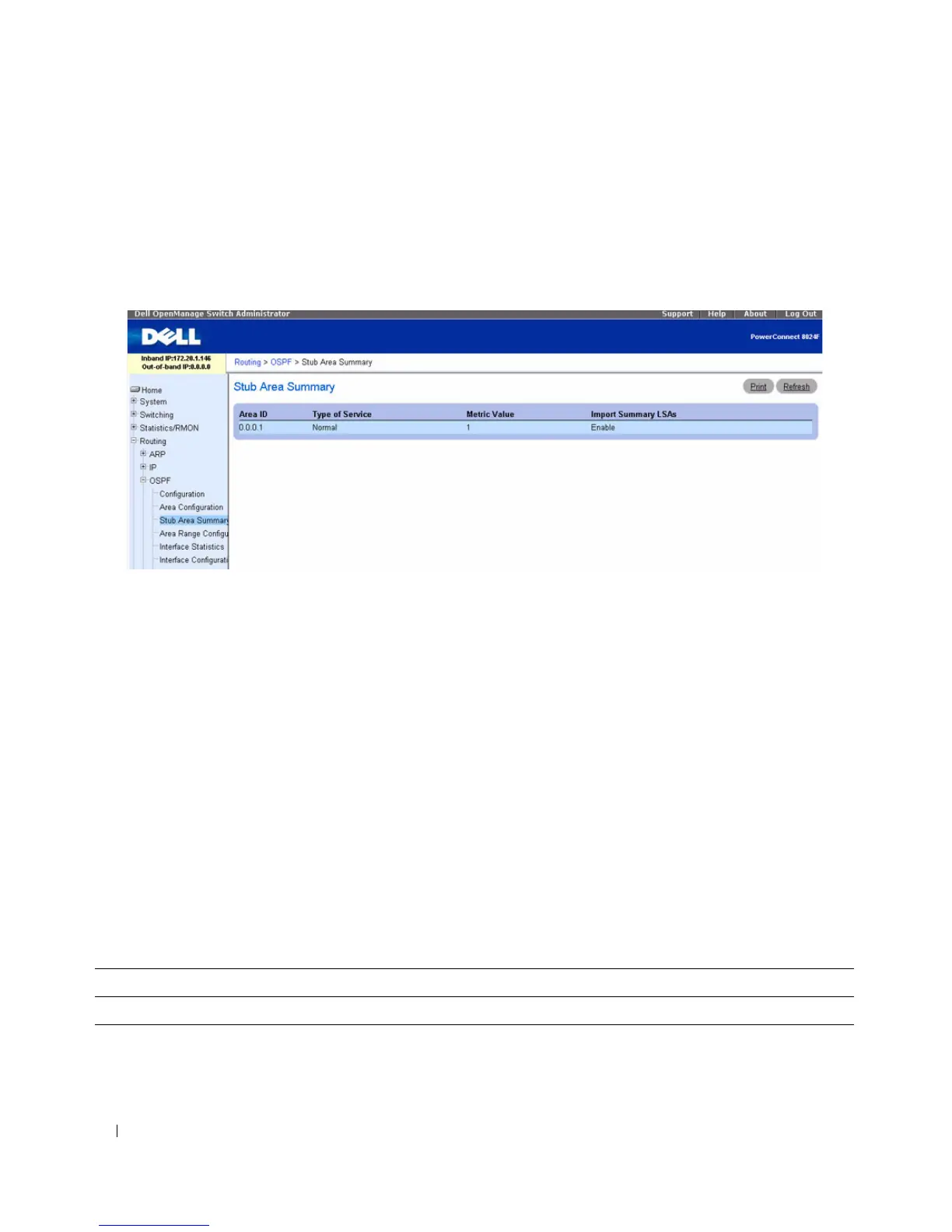 The OSPF Stub Area Summary page displays OSPF stub area detail.
