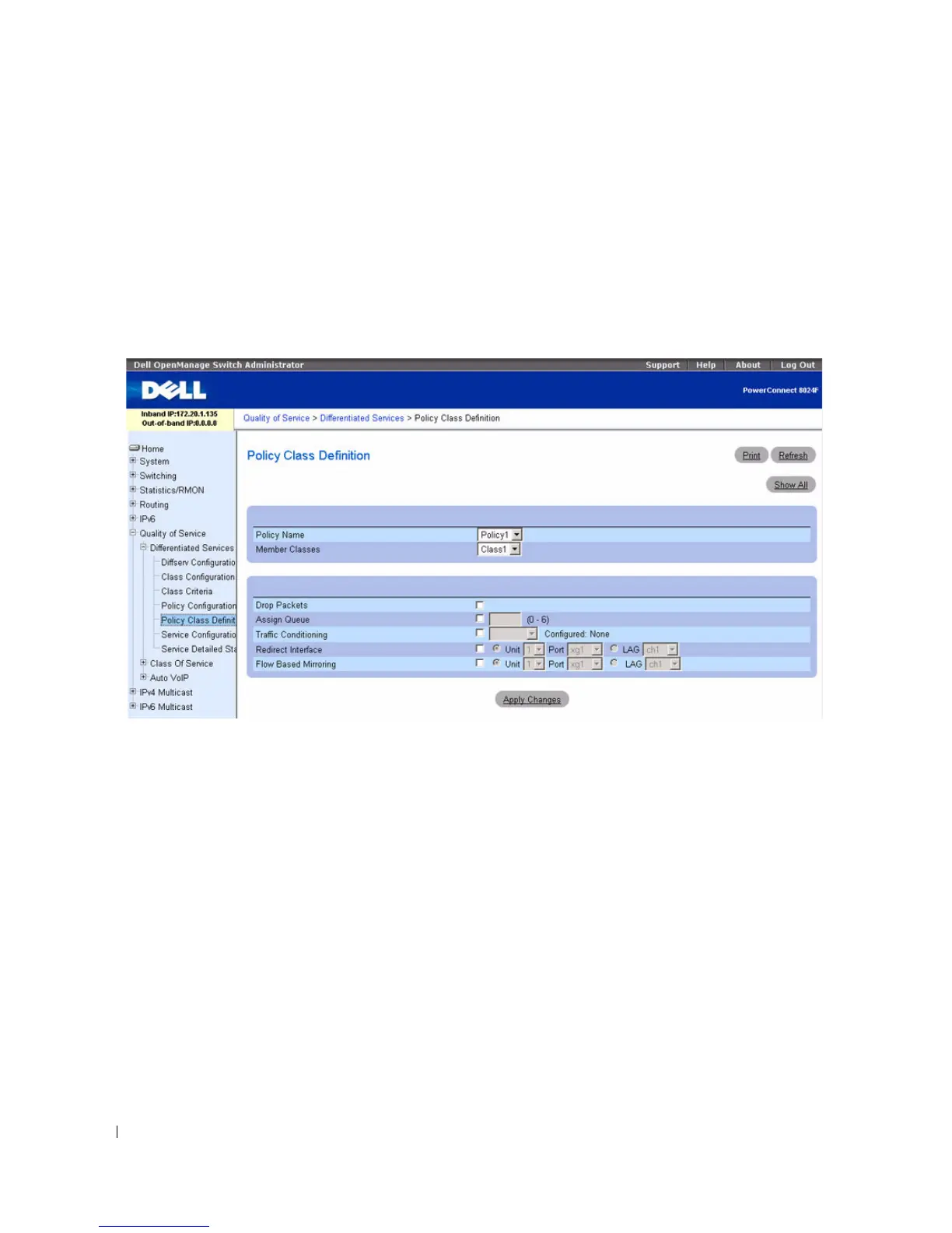 Diffserv Policy Class Definition page to associate a class to a policy, and to define attributes for