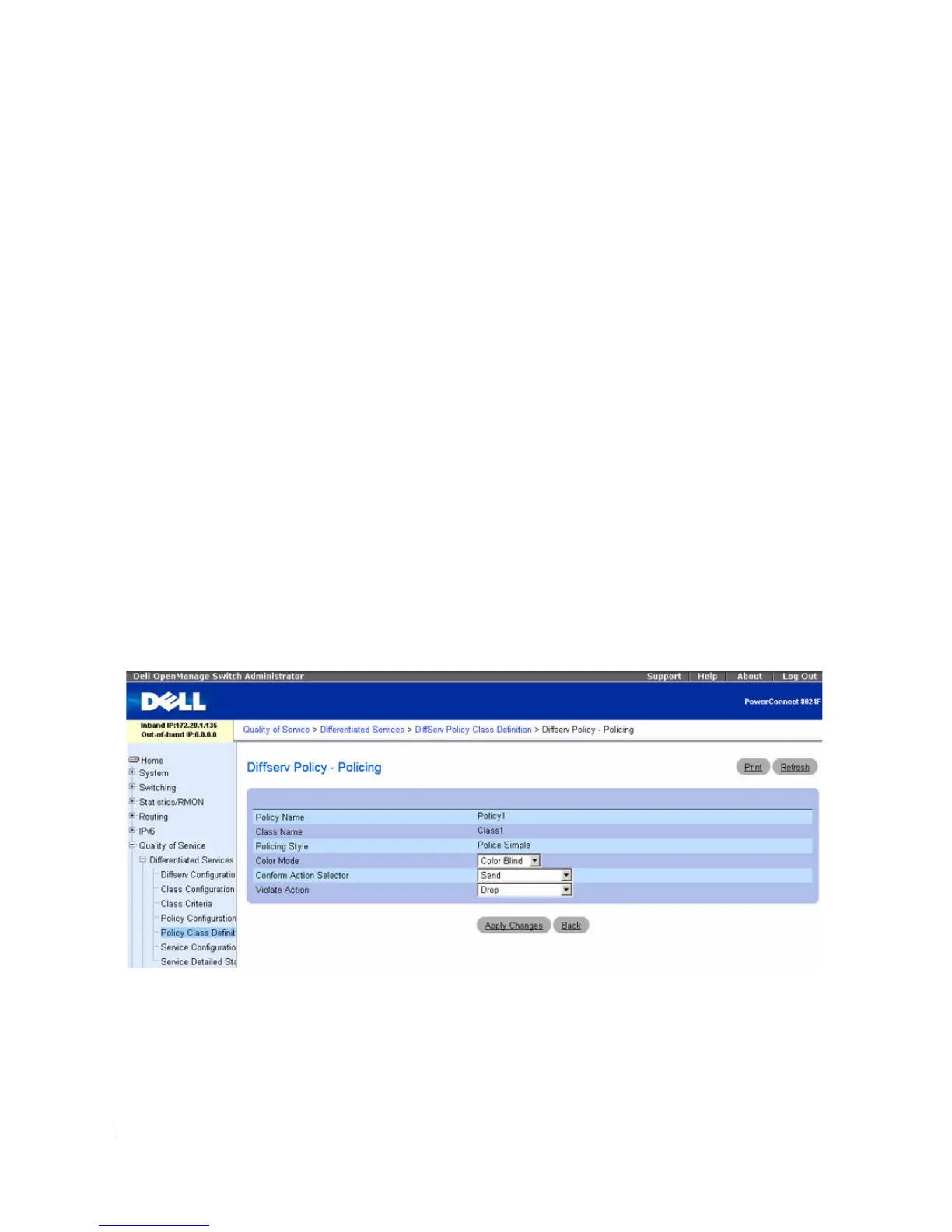 When Policing is chosen as the Traffic Condition, the following Diffserv Policy - Policing page displays.