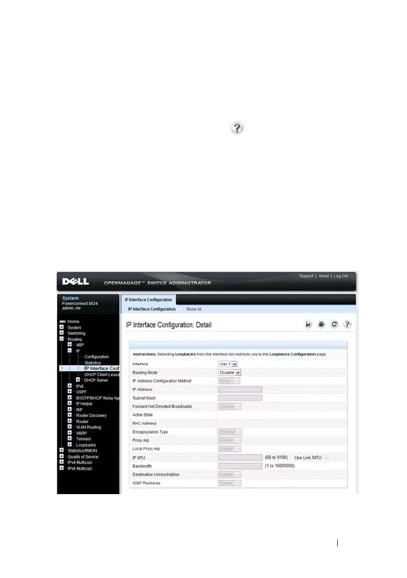 Administrator pages for configuring and monitoring VLAN routing interfaces,