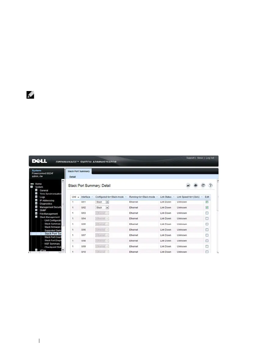 Use the Stack Port Summary page to configure the stack-port mode and to