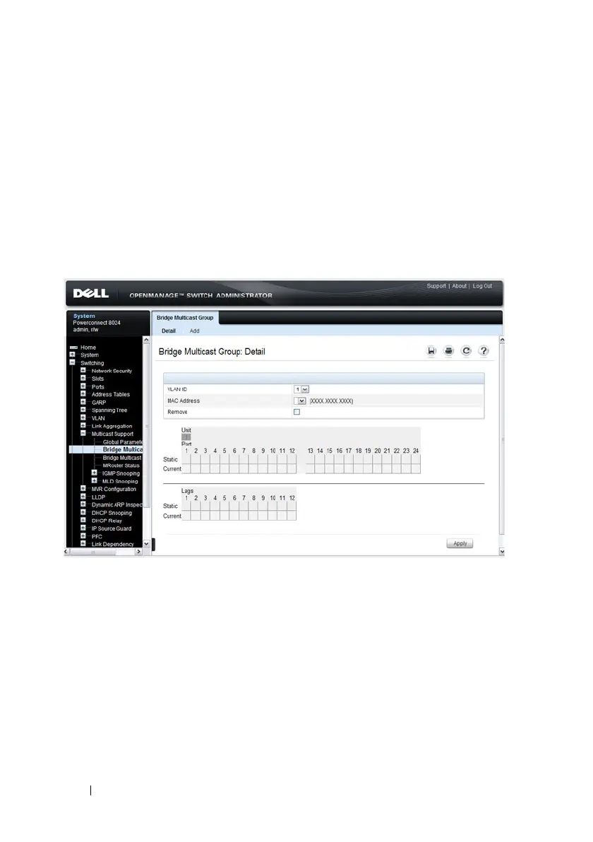 The Bridge Multicast Group tables display which Ports and LAGs are