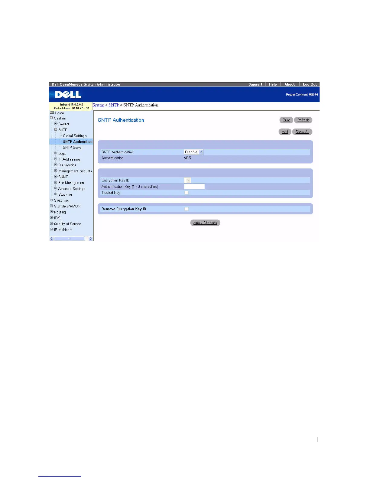 The SNTP Authentication page contains the following fields: