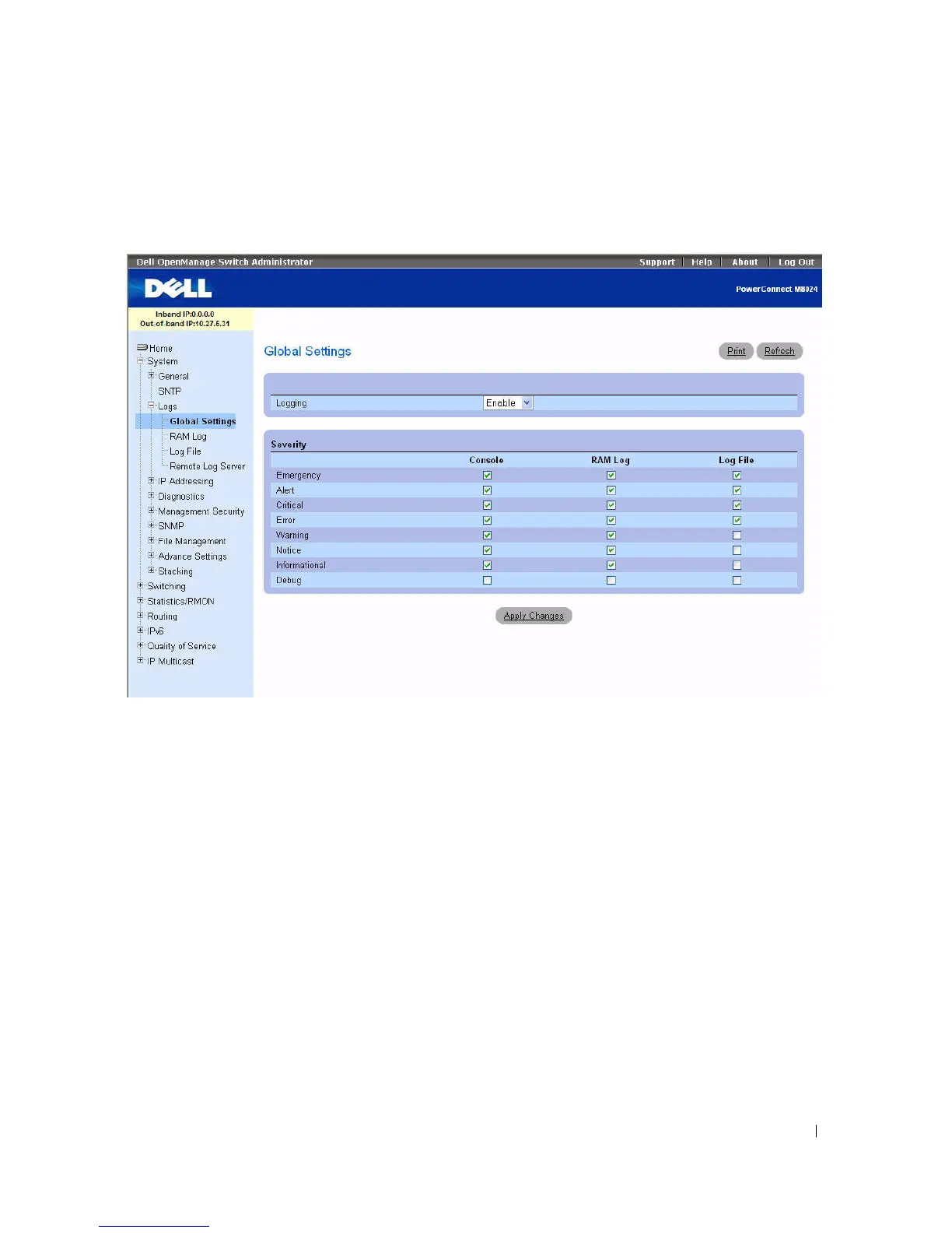 To display the Global Settings page, click System > Logs > Global Settings in the tree view.