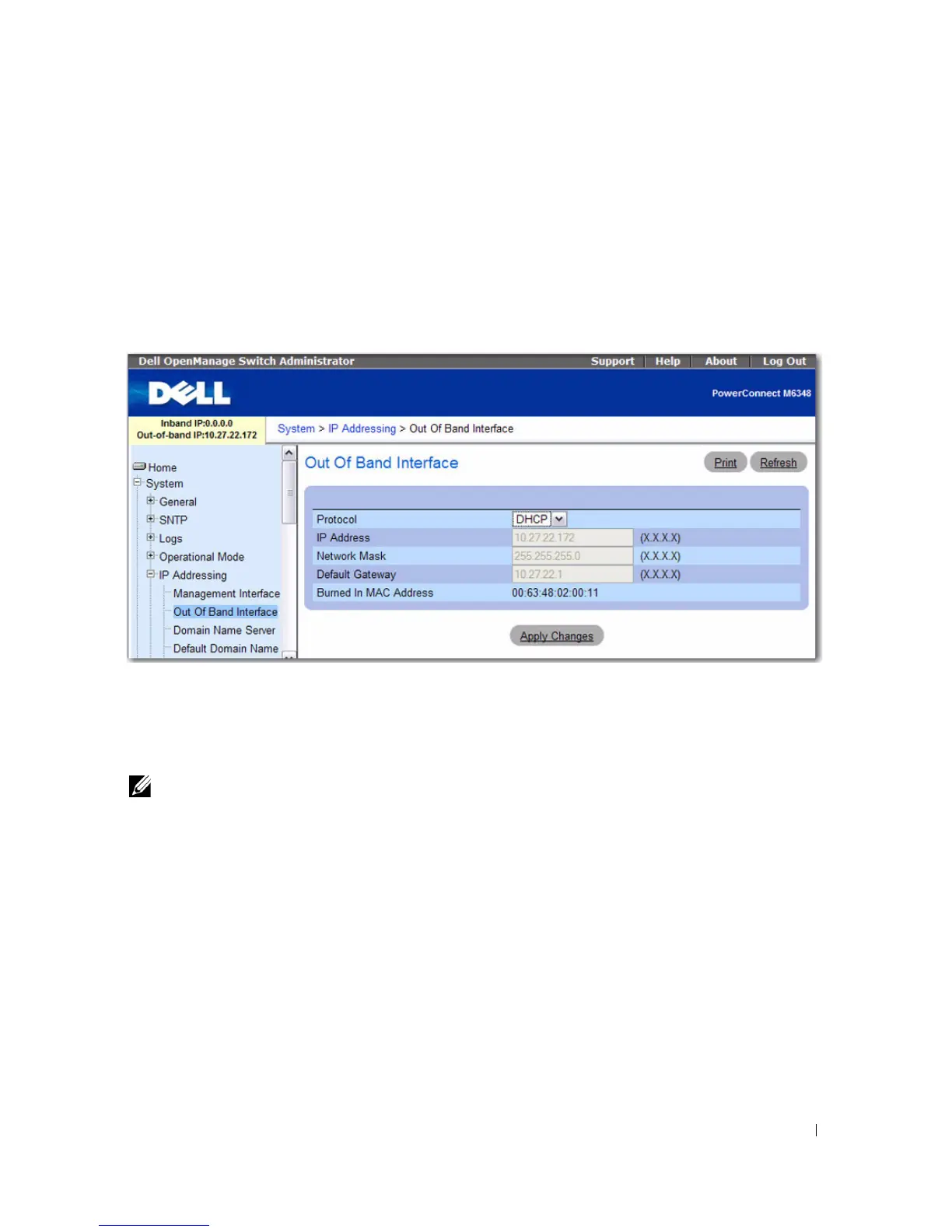 To display the Out of Band Interface page, click System > IP Addressing > Out of Band Interface in