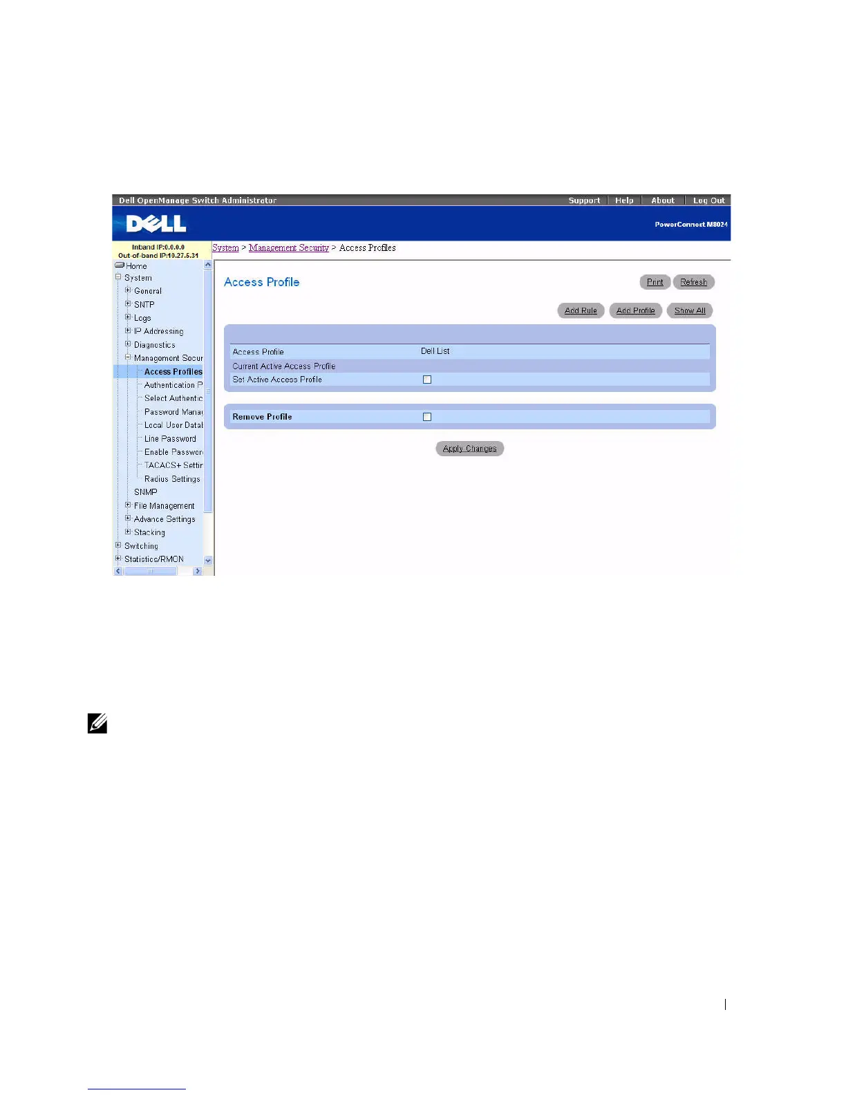 Note: Assigning an access profile to an interface implies that access through other interfaces is denied. If an