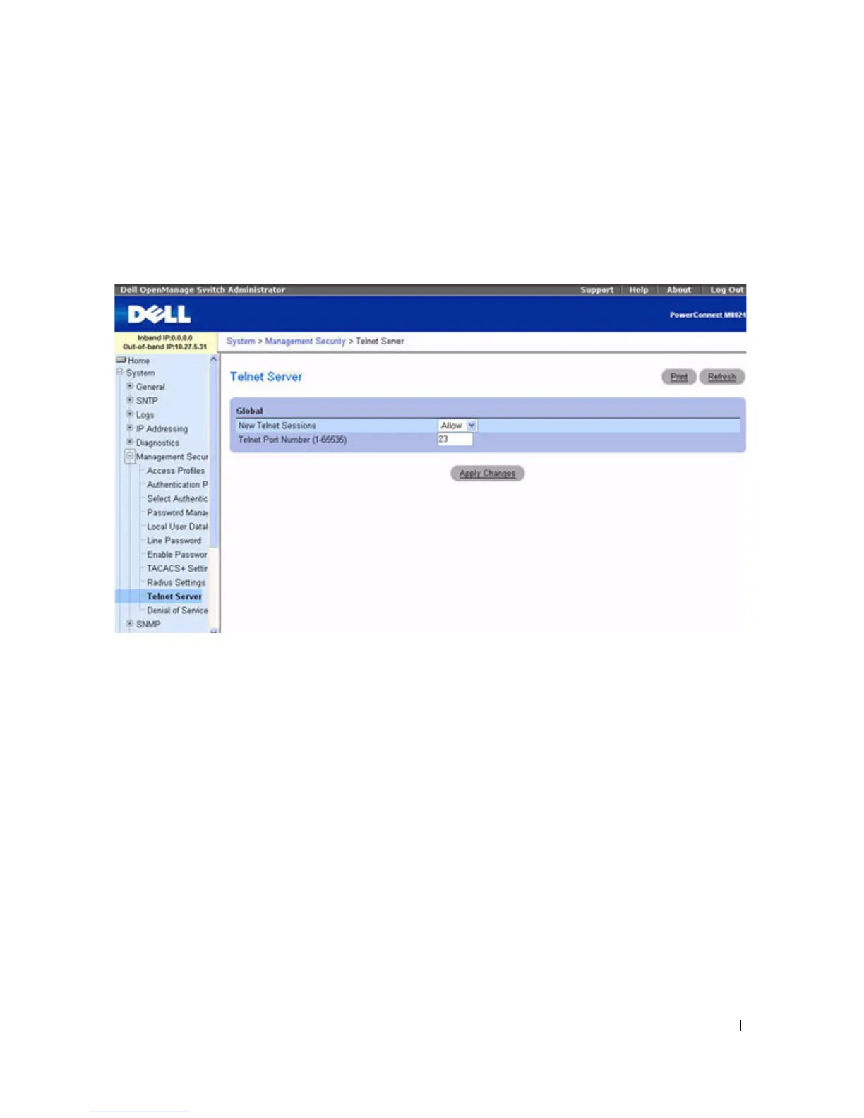 To display the Telne t Ser ver page, click System > Management Security > Telnet Server.