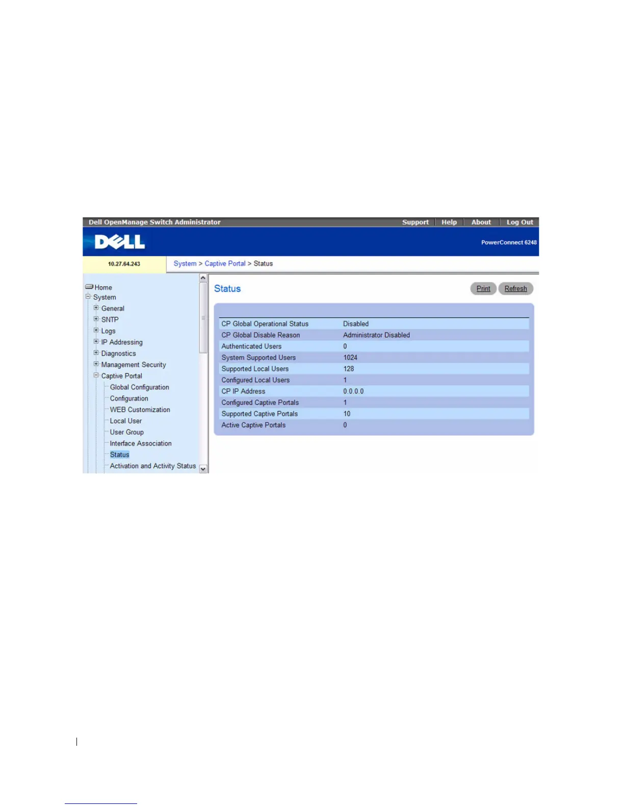 To view captive portal status information, click System > Captive Portal > Status.