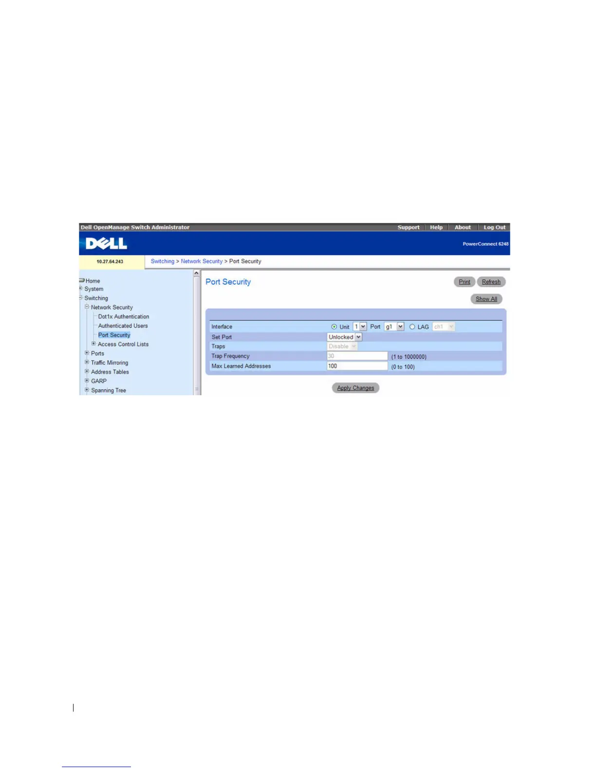 To display the Port Security page, click Switching > Network Security > Port Security in the tree view.