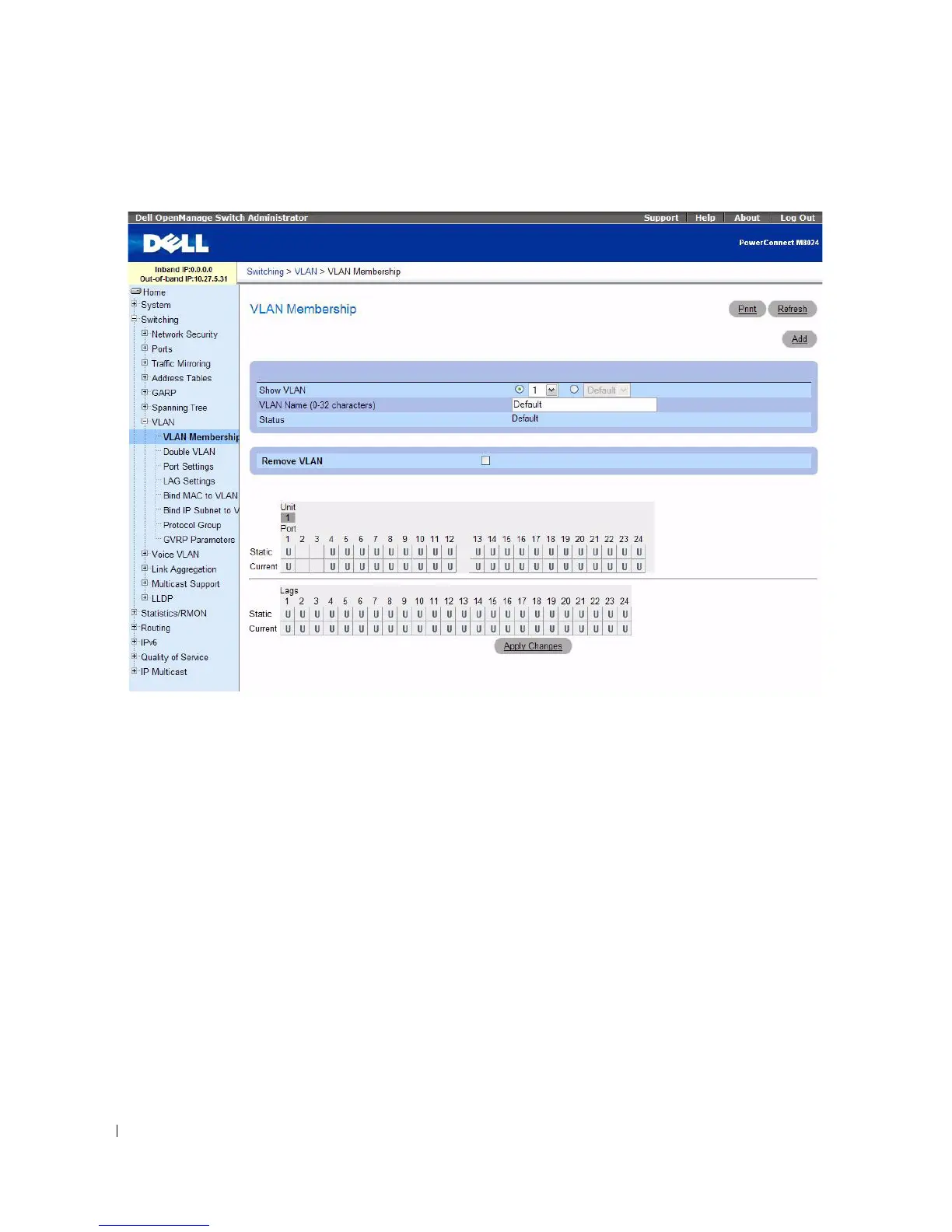the entire VLAN’s membership. The bottom section contains tables that define membership settings for
