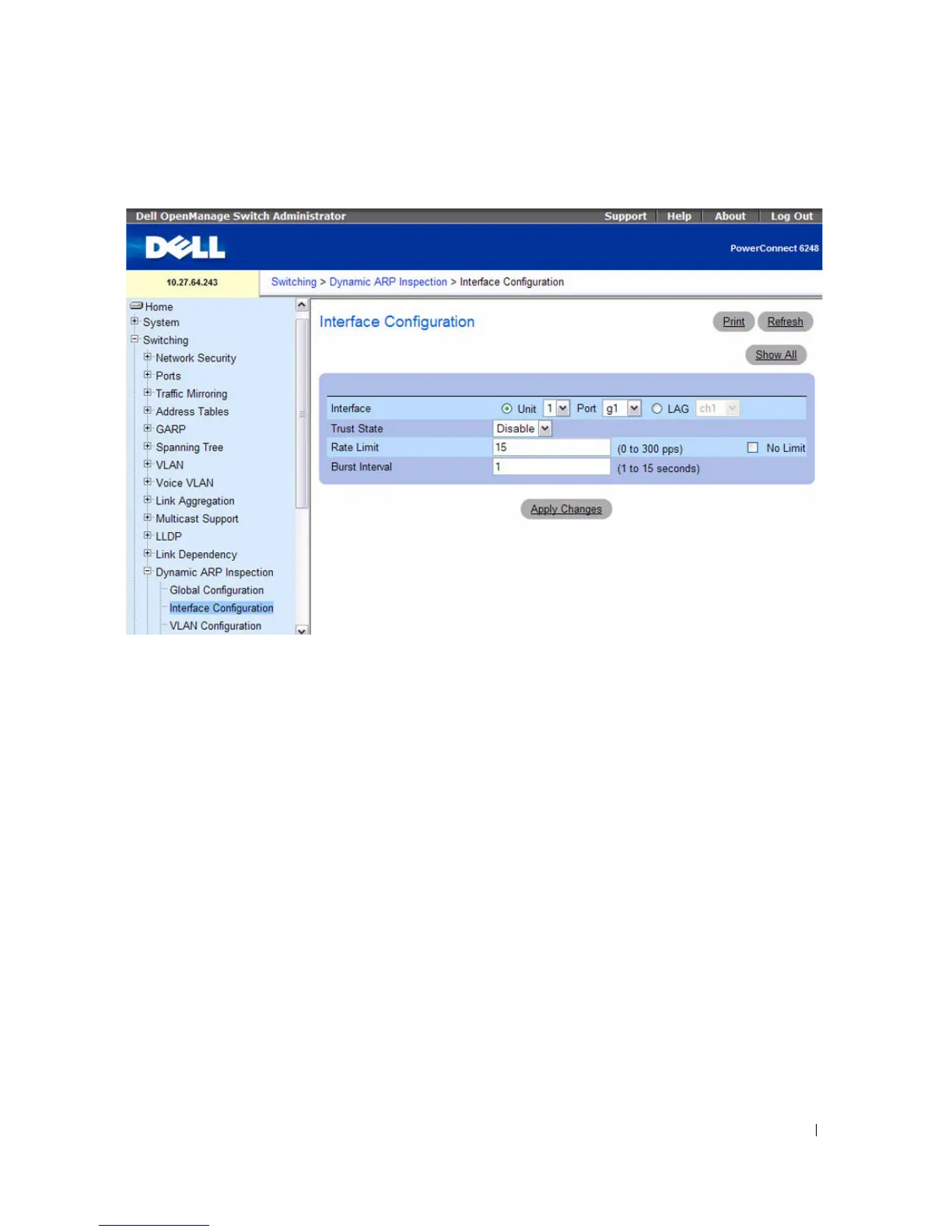 The Dynamic ARP Inspection Interface Configuration page contains the following fields: