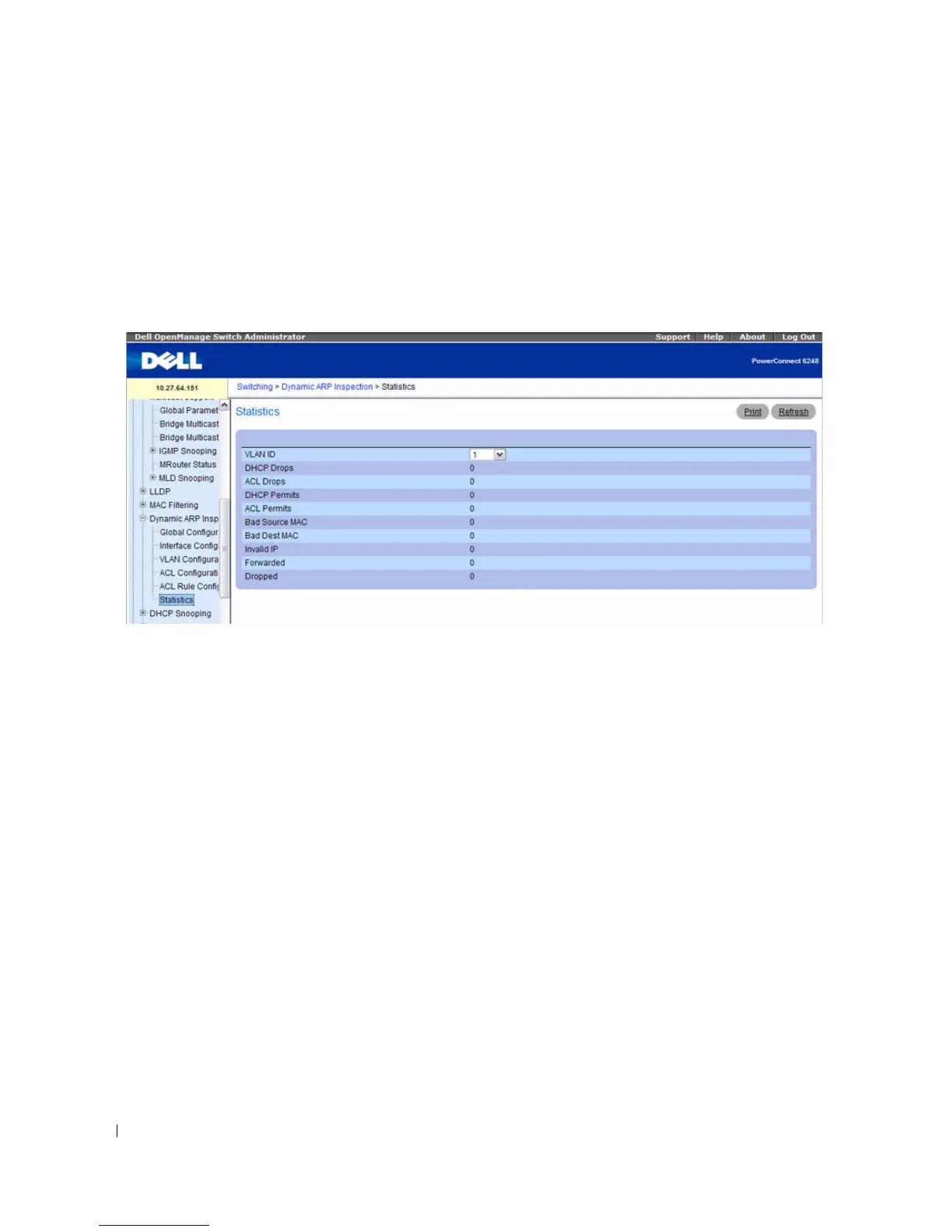 To display the DAI Statistics page, click Switching > Dynamic ARP Inspection > Statistics in the