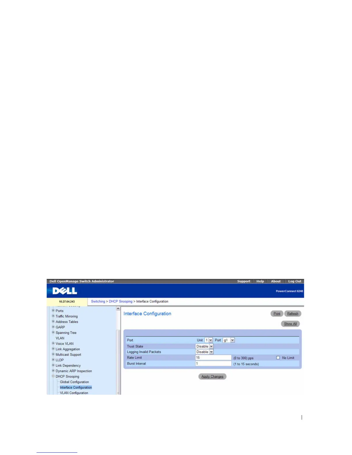 drops the packet. You can disable this feature using the DHCP Snooping Interface Configuration page