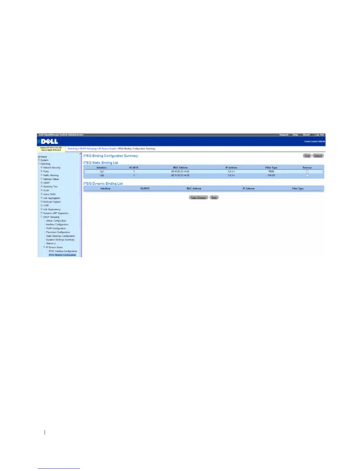 To access the IPSG Binding Configuration Summary page, click Switching > DHCP Snooping > IP
