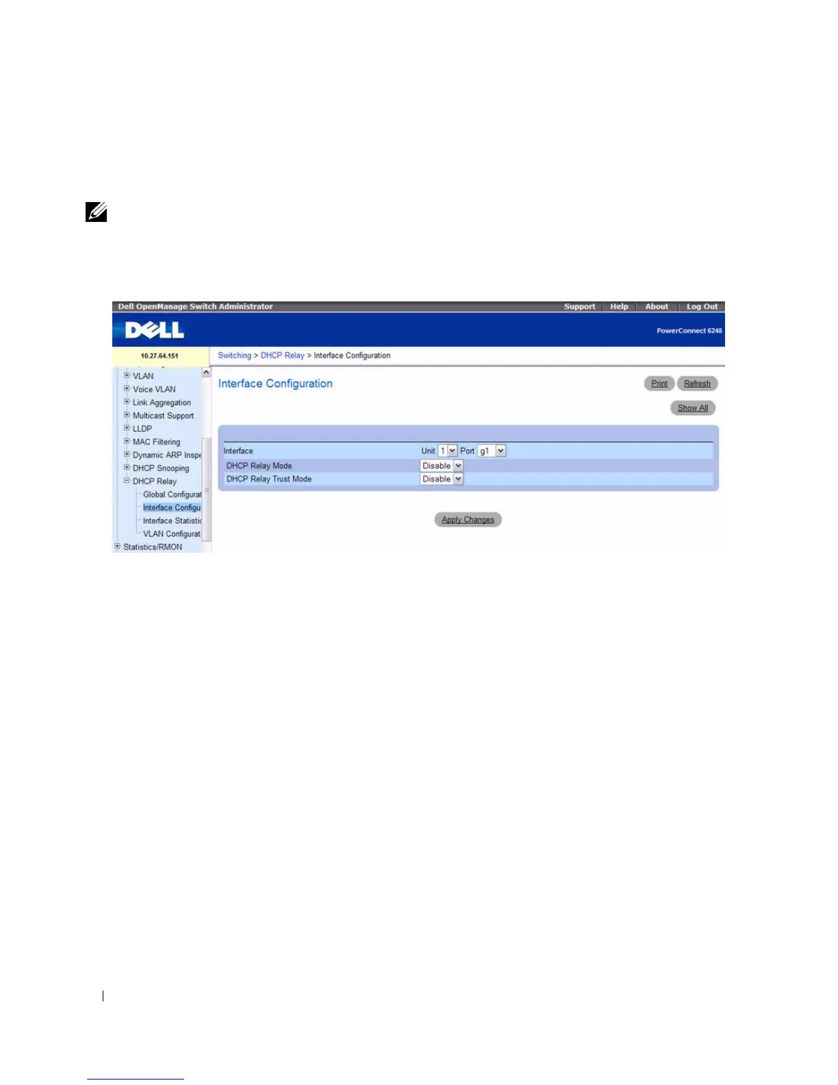 To access this page, click Switching > DHCP Relay > Interface Configuration in the tree view.