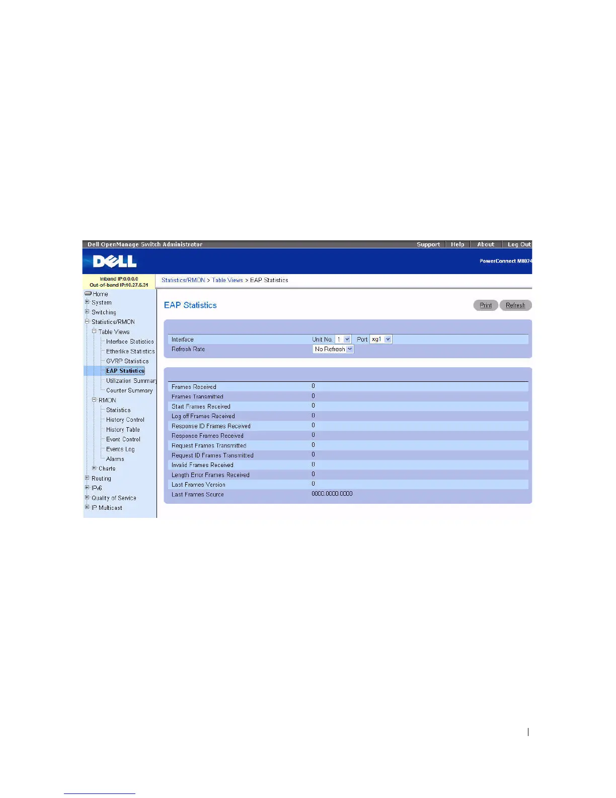 To display the EAP Statistics page, click Statistics/RMON > Table Views > EAP Statistics in the tree