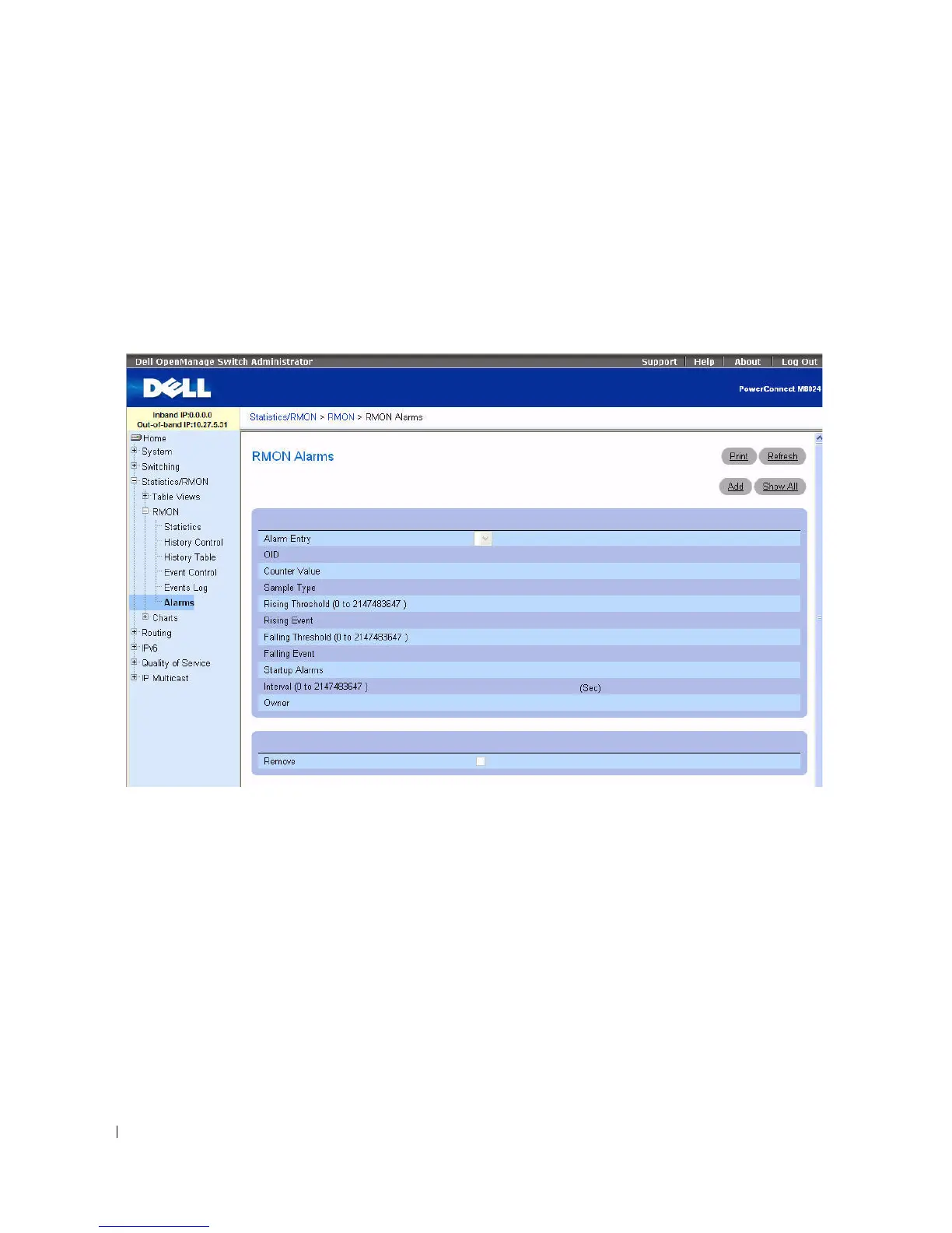 To display the page, click Statistics/RMON > RMON > Alarms in the tree view.