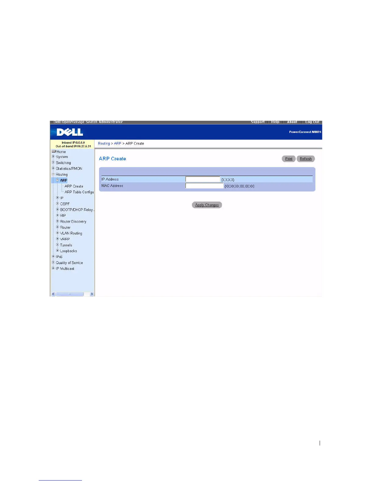 To display the page, click Routing > ARP > ARP Create in the tree view.