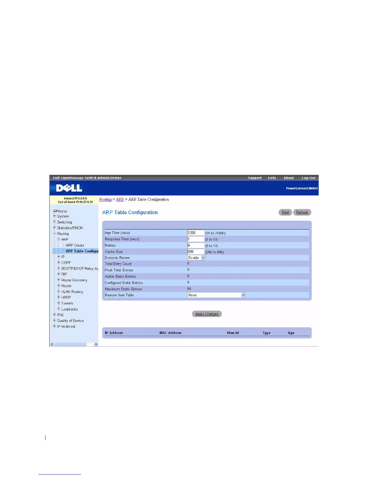 To display the page, click Routing > ARP > ARP Table Configuration in the tree view.