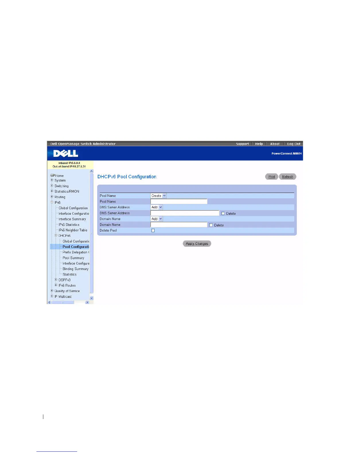 To display the page, click IPv6 > DHCPv6 > Pool Configuration in the tree view.