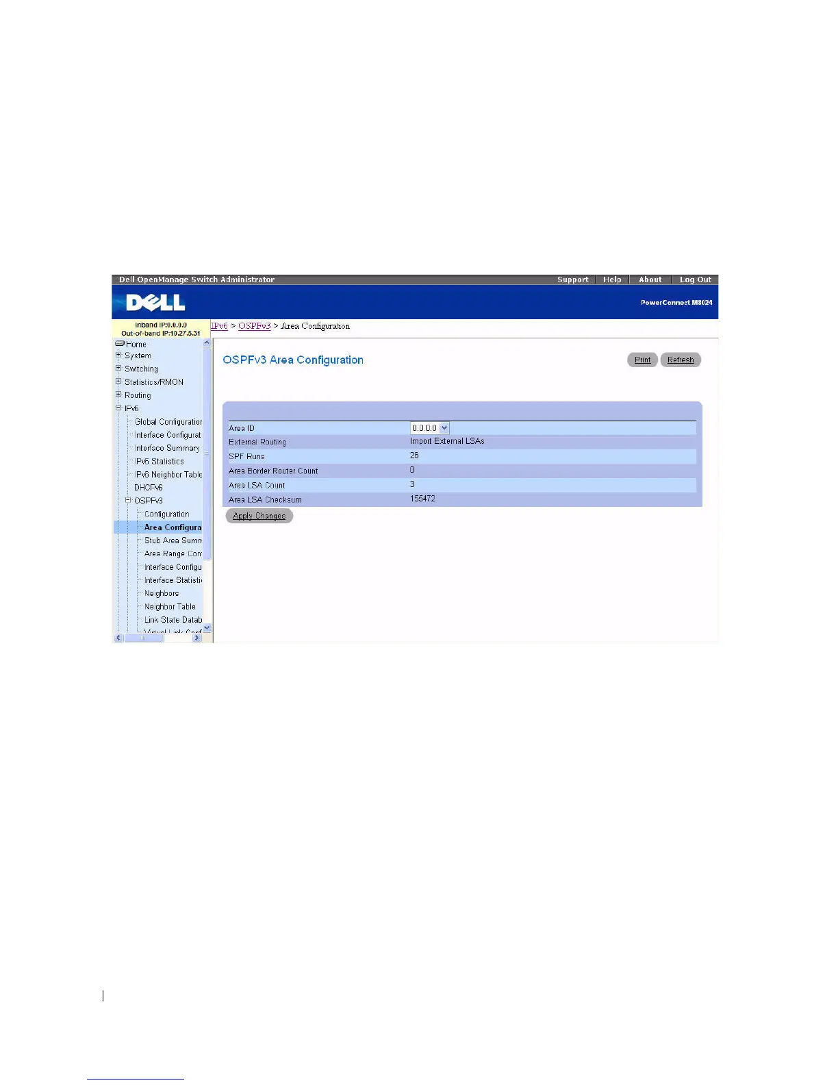 To display the page, click IPv6 > OSPFv3 > Area Configuration in the tree view.