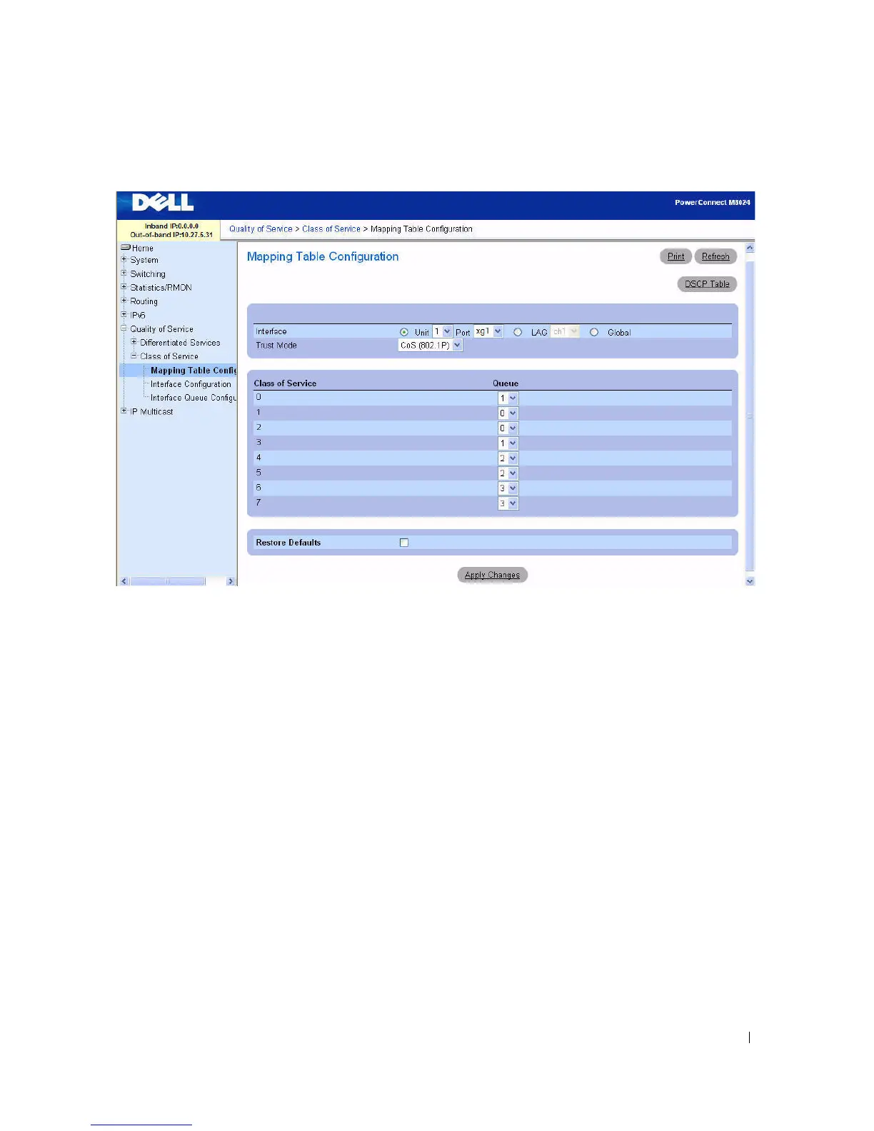 The CoS (802.1P) Mapping Table Configuration page contains the following fields: