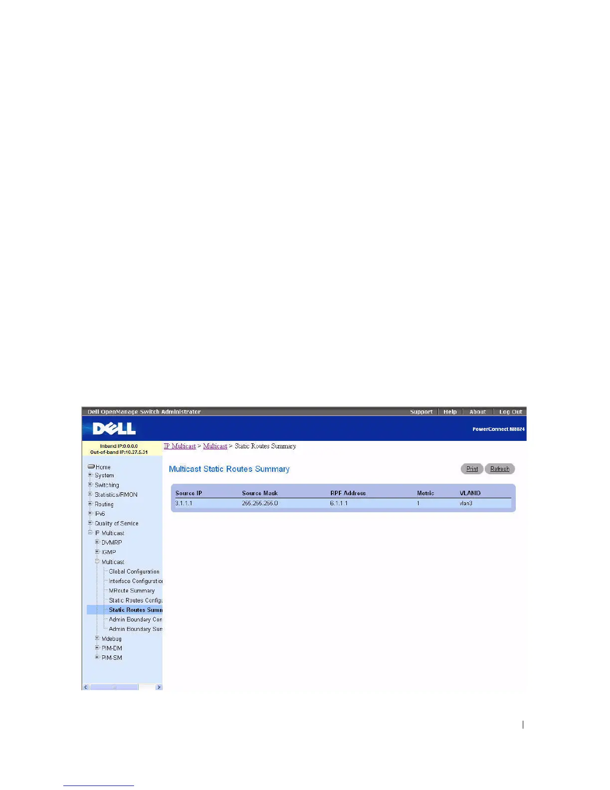 To display the page, click IP Multicast > Multicast > Static Routes Summary in the tree view.
