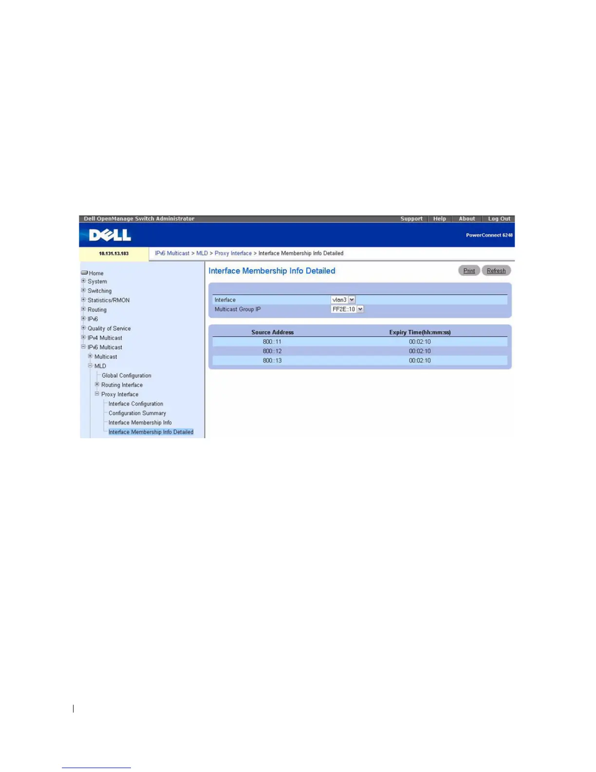 page, click IPv6 Multicast > MLD > Proxy Interface > Interface Membership Info Detailed in the