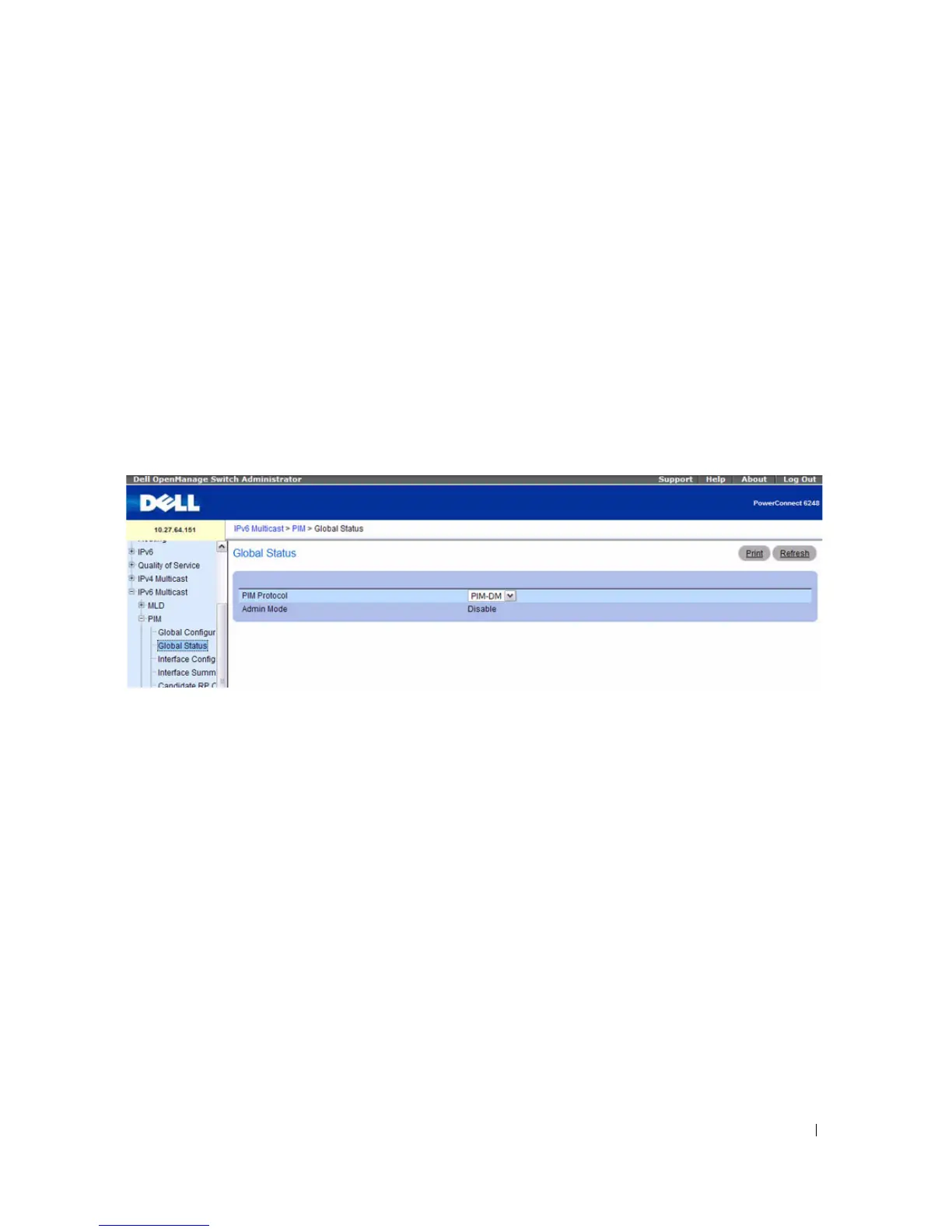 To display the page, click IPv4 Multicast > PIM-DM > Global Status or IPv6 Multicast > PIM >